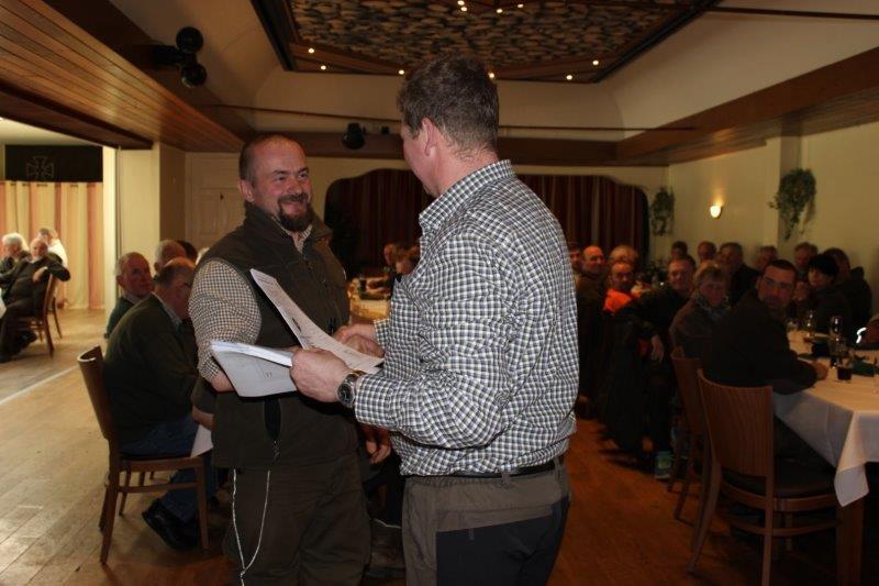 Fazit: Alles in allem war es ein sehr erfolgreicher Prüfungstag, an dem Wetter, Wild, Hund und Hundeführer gut zusammen gespielt haben. Nach Vergabe der Prüfungsergebnissen und Preisverteilung bedankten sich die beiden Suchensieger mit einem kleinem Umtrunk.