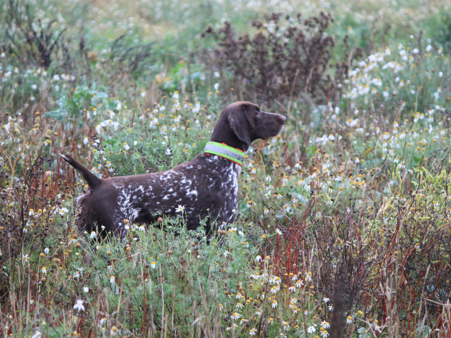Die Feldarbeit absolviert er planmäßig, weiträumig, zügig und ausdauernd in Abstimmung mit dem Führer. Auch im Wald arbeitet er passioniert mit Übersicht und führerbezogen. Bei der Wasserarbeit überzeugt Dux mit seiner Passion, Ausdauer und absolutem Finderwillen. Von den 6 im Wurf gefallenen Hunden haben 3 erfolgreich die VGP bestanden. 4 Geschwister zeigen sich im Jagdeinsatz als führige Jagdhunde mit unbedingtem Finderwillen und großer Wasserpassion. Im Einsatz auf Niederwild und Sauen arbeiten sie mit Jagdverstand.
